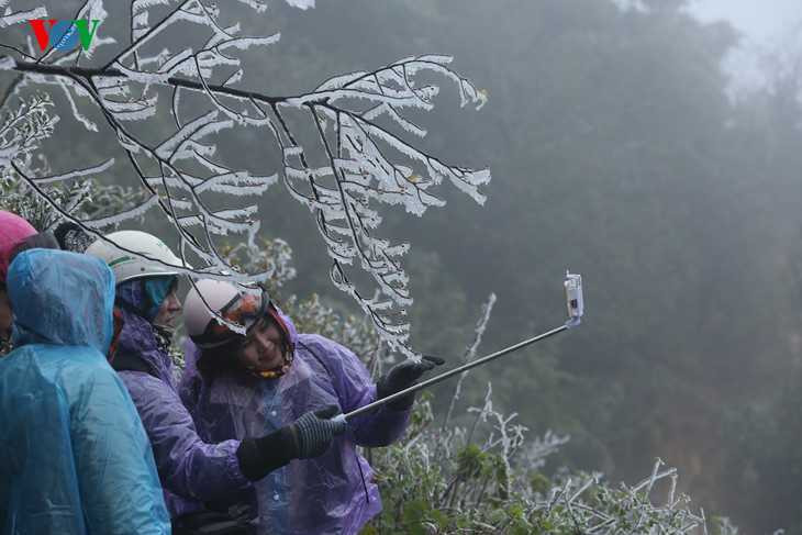 Nhiệt độ giảm xuống dưới 0 độ C khiến băng giá phủ trắng nhiều khu vực ở Sa Pa, tiết trời lạnh buốt không làm chùn chân các du khách đam mê chụp ảnh.