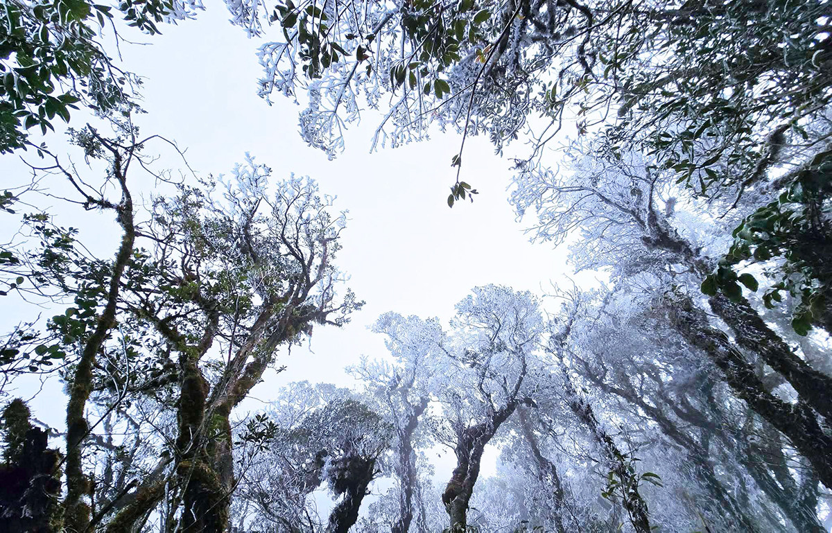 Băng giá phủ kín trên từng ngọn cây ở đỉnh Tà Xùa. (Ảnh: Khương La)