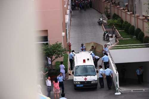 | Xe cứu thương đến đưa thi thể nạn nhân nhảy lầu tự tự tại bệnh viện Từ Dũ đi khám nghiệm tử thi |