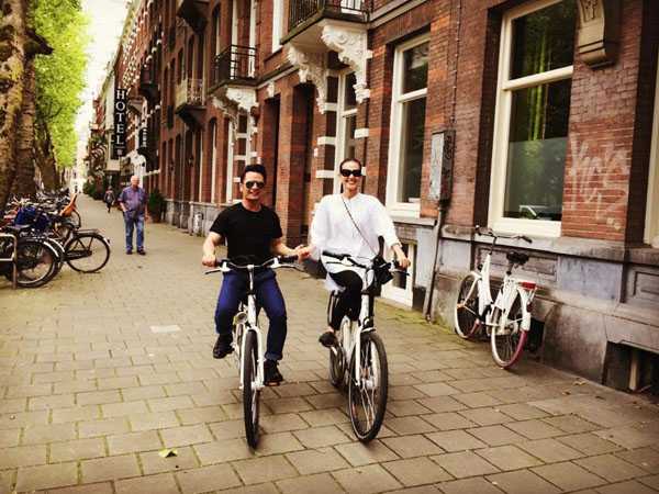 | Bằng Kiều vừa chia sẻ một số hình ảnh anh và người yêu mới - Hoa hậu Dương Mỹ Linh - đạp xe dạo chơi ở thành phố Amsterdam, Hà Lan. Nam ca sỹ chú thích: 'Mười mấy năm rồi mới đi xe đạp. Tay lái vẫn còn lụa lắm'. |