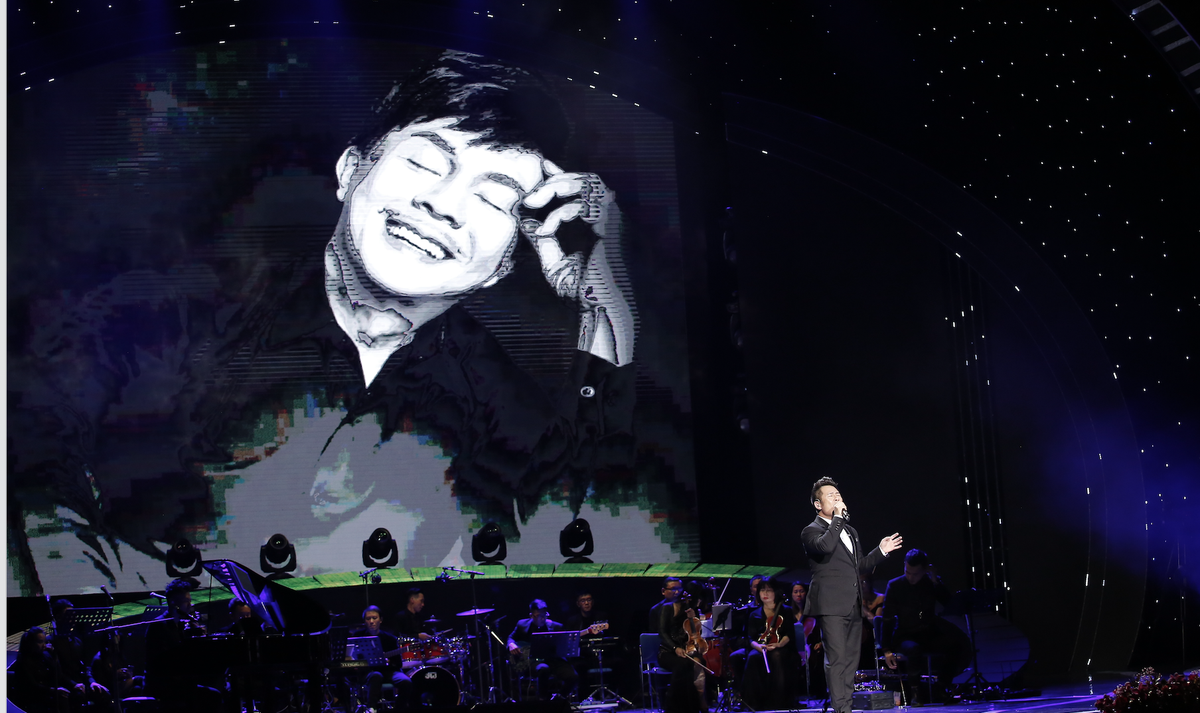Bằng Kiều hát nhạc Chí Tài cùng di ảnh của anh trên sân khấu. (Ảnh: Vũ Toàn)