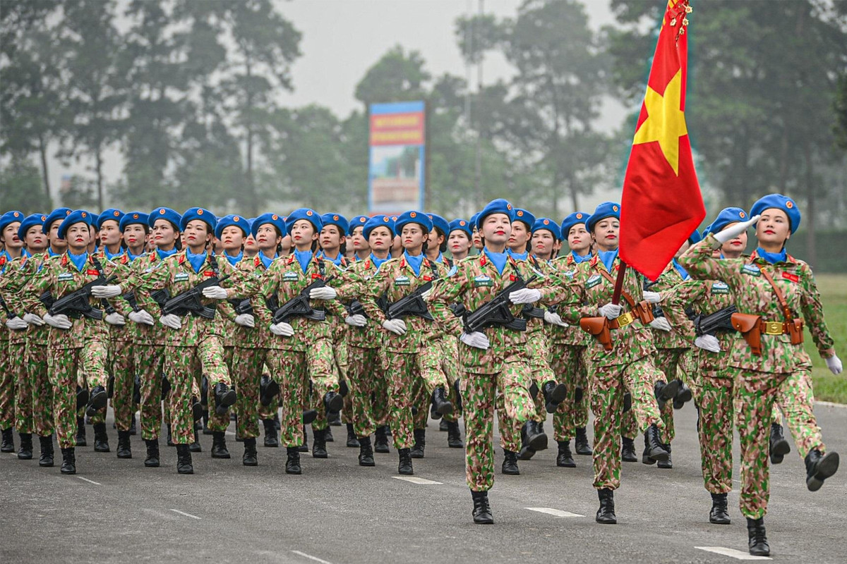 Các chiến sĩ thuộc khối lực lượng Gìn giữ hòa bình Việt Nam tập luyện diễu binh, diễu hành kỷ niệm 70 năm Chiến thắng Điện Biên Phủ. (Ảnh: Đắc Huy)