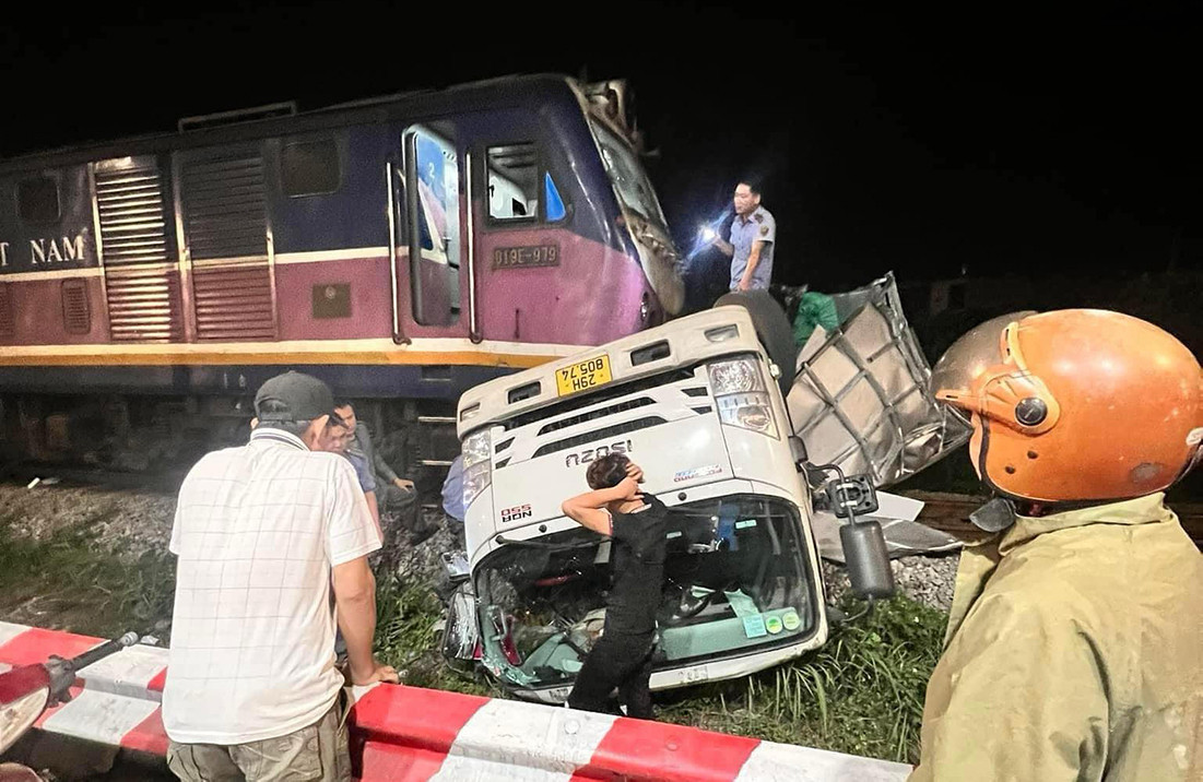 Tại hiện trường, ô tô tải nằm chỏng chơ ngang đường ray, phần đầu gần như gãy rời, thân sau bẹp rúm.