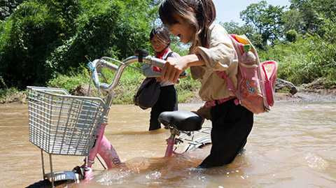| Để kịp lịch học chiều, từ 9-10g sáng, các học sinh từ khối lớp 4 đến lớp 9 phải băng rừng, vác xe qua suối để đến trường ở trung tâm xã Ea Kiết |