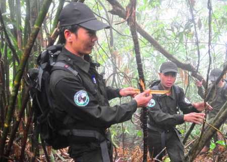 | Cán bộ BVR gỡ bẫy của người dân gắn trong Khu bảo tồn Sao La |