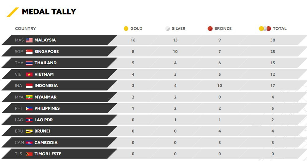 Bảng tổng sắp huy chương SEA Games 29 ngày 25/8 lúc 09h00