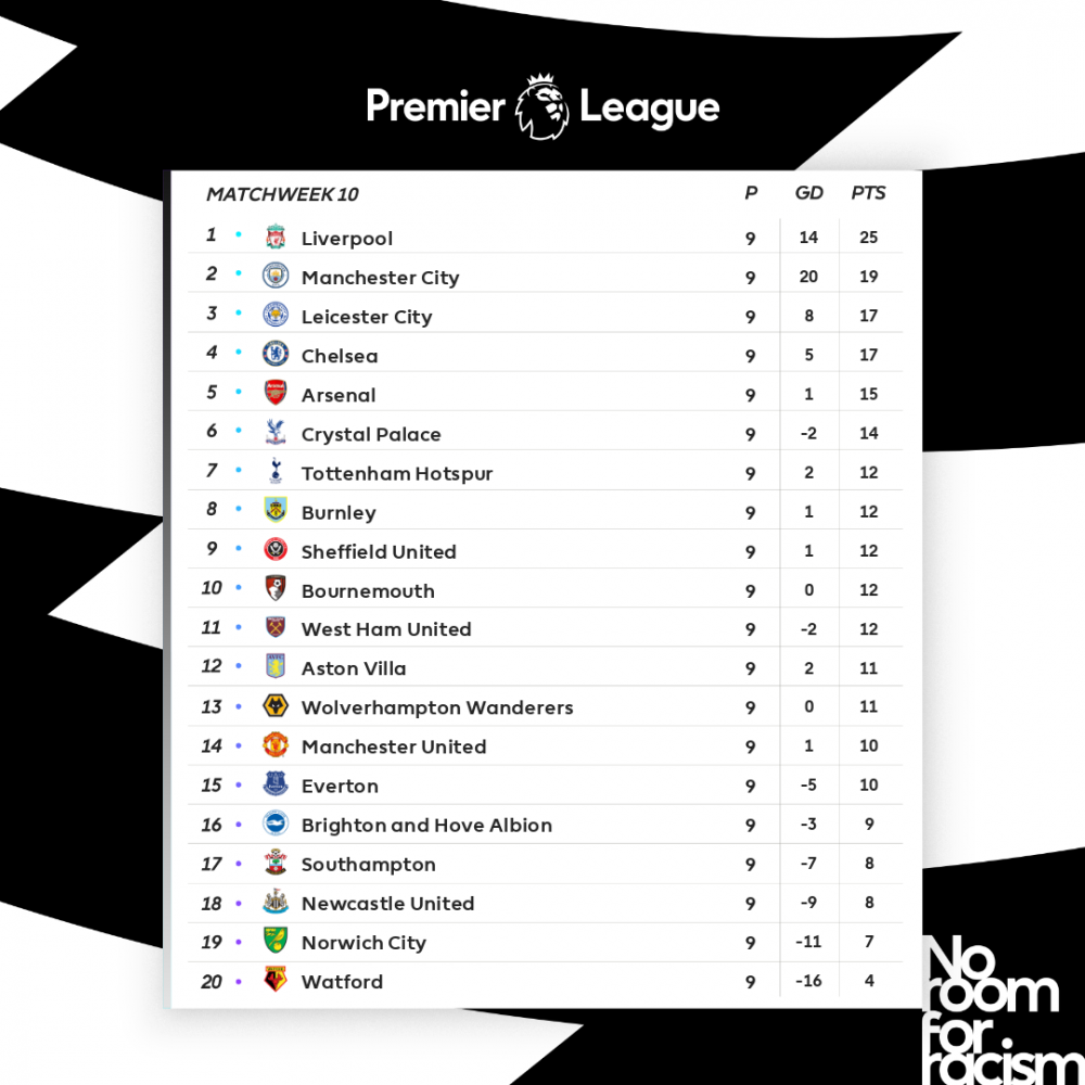Kết thúc vòng 10, Liverpool vẫn độc chiếm ngôi đầu bảng, Man City đứng thứ nhì. Leicester City và Chelsea so kè quyết liệt ở 2 vị trí tiếp theo.