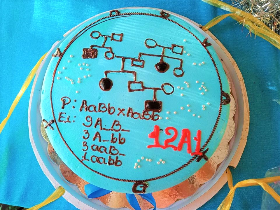 Mới đây, chiếc bánh kem vẽ chi chít sơ đồ phả hệ di truyền học cùng kết quả của phép lại di hợp – những kiến thức ở môn Sinh của học sinh lớp 12 trường THPT Dương Háo Học (tỉnh Trà Vinh) thu hút sự chú ý của cộng đồng mạng. (Ảnh: Nguyễn Thị Thúy Oanh)