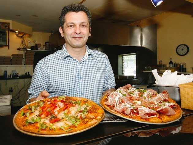 Ông chủ Hatami bên cạnh những sản phẩm Pizza của cửa hàng