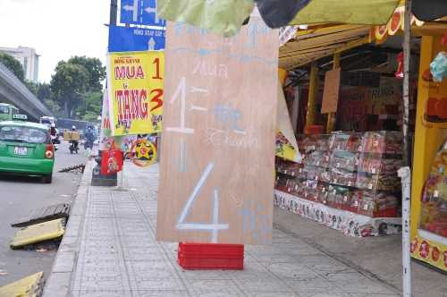 Cửa hàng bánh Trung thu trên đường Nguyễn Tri Phương (quận 5) treo bảng đại hạ giá mua 1 tặng 3, tại một gian hàng khác trên đường 3 Tháng 2 (quận 10) lại khuyến mãi "mua 1 tặng 4".