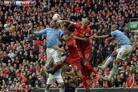 Pha bóng gây tranh cãi cuối cùng diễn ra ở phút bù giờ thứ 4. Một đường treo bóng bổng của Man City vào khu cấm địa đội chủ nhà đã được trung vệ Martin Skrtel hóa giải bằng... tay. Pha quay chậm cũng như hình ảnh chụp lại từ video cho thấy rất rõ, người nâng tỷ số lên 2-0 đã cố tình chơi bóng như một thủ môn, khi cố gắng đấm bóng ra khỏi tầm tranh chấp của Javi Garcia bên phía Man City.