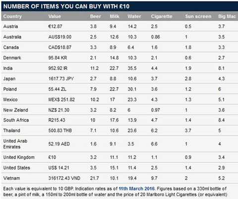 Cuộc nghiên cứu do công ty International Currency Exchange (ICE) thực hiện, bằng cách sử dụng 10 bảng Anh (hơn 316.000 đồng) để mua một vài món đồ cần thiết ở 15 thị trường khác nhau, từ đó tiến hành so sánh và đưa ra kết quả xem nơi nào rẻ nhất.