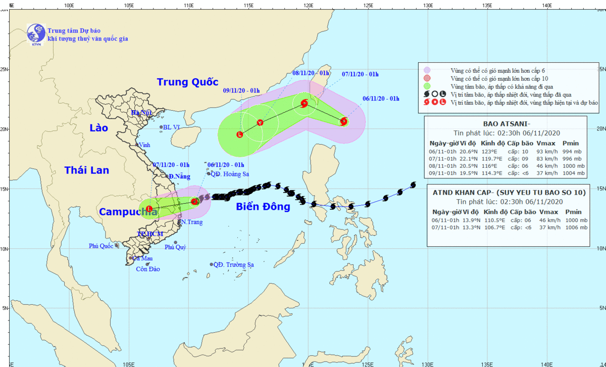 Khoảng 1h ngày 6/11, vị trí tâm bão Atsani ở khoảng 20,6 độ Vĩ Bắc; 123,0 độ Kinh Đông, cách đảo Luzon, Philippines khoảng 290km về phía Đông Bắc. Sức gió mạnh nhất vùng gần tâm bão mạnh cấp 9-10 (75-100km/giờ), giật cấp 12.