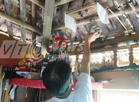 | Thầy mo Lựng lấy túi phép trên bàn thờ xuống cho khách xem |