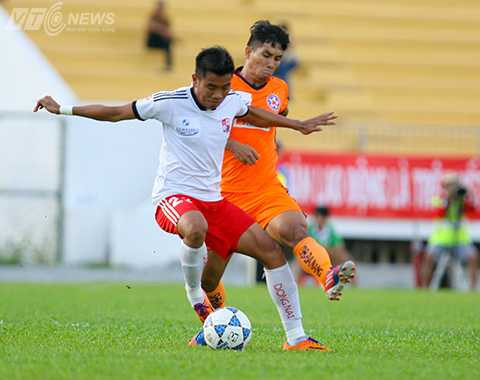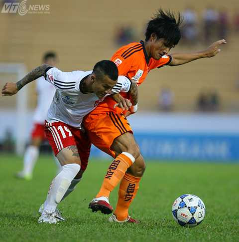 | Mất 6 cầu thủ, Đồng Nai (áo trắng) vẫn thắng được SHB Đà Nẵng (Ảnh: VSI) |
