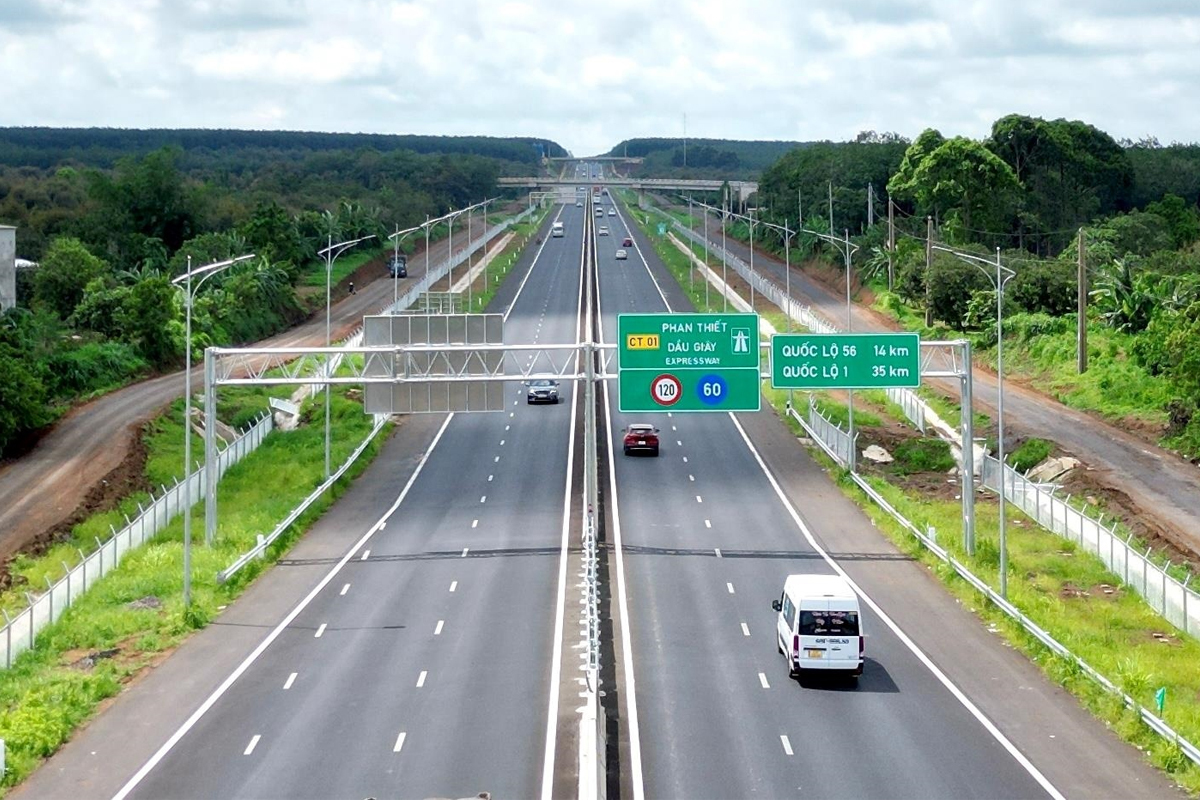 Cao tốc Dầu Giây - Phan Thiết được thiết kế chiều rộng mặt đường hơn 32m, quy mô 6 làn xe, vận tốc tối đa 120km/h - tối thiểu 60 km/h. (Ảnh: Thy Huệ).