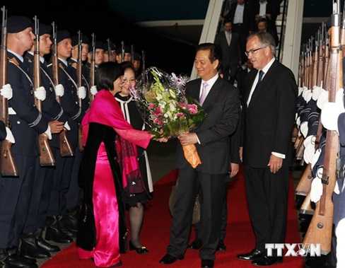| Lễ đón Thủ tướng Nguyễn Tấn Dũng tại sân bay Tegel ở thủ đô Berlin, đêm 14/10 (theo giờ Việt Nam). (Ảnh: Đức Tám/TTXVN) |