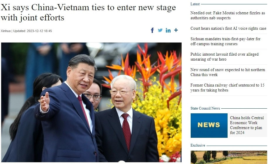 Trước đó, trong ngày 12/12, bài viết của Tổng Bí thư, Chủ tịch Tập Cận Bình đăng trên Báo Nhân Dân của Việt Nam đã được truyền thông Trung Quốc đưa trang trọng.