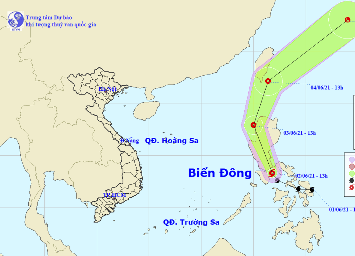 Hồi 13h ngày 2/6, vị trí tâm bão ở trên khu vực miền Trung Philippines. Sức gió mạnh nhất vùng gần tâm bão mạnh cấp 8 (60-75km/giờ), giật cấp 10.