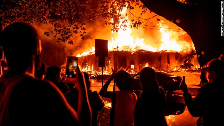 Người biểu tình đốt phá một công trình xây dựng ở Minnesota. (Ảnh: CNN)