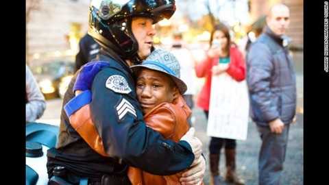 Cậu bé Devonte Hart, 12 tuổi, cầm theo biểu ngữ 'Free Hugs' (ôm tự do) đi trong đám đông biểu tình phản đối quyết định của bồi thẩm đoàn không truy tố cảnh sát Darren Wilson vì đã sát hại thanh niên da đen Michael Brown bằng 12 phát đạn.