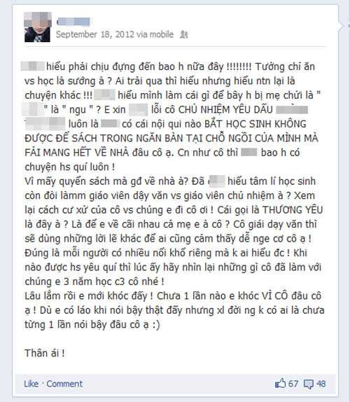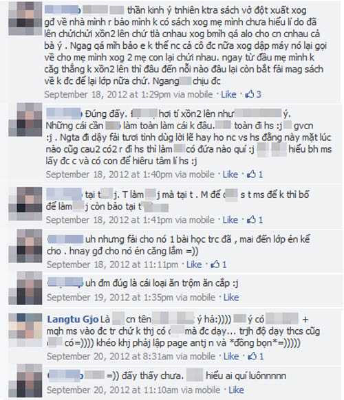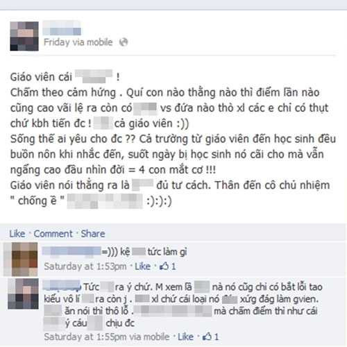 Gần đây, cư dân mạng lại xôn xao về việc một nữ sinh THPT tại Hà Nội đăng tải hàng loạt những câu chửi rủa tục tĩu dành cho cô giáo có tên H.T.H trên trang cá nhân của mình. Được biết, đây là cô giáo chủ nhiệm đồng thời là giáo viên dạy văn của lớp 12 tại trường C.G – nơi nữ sinh này đang theo học.