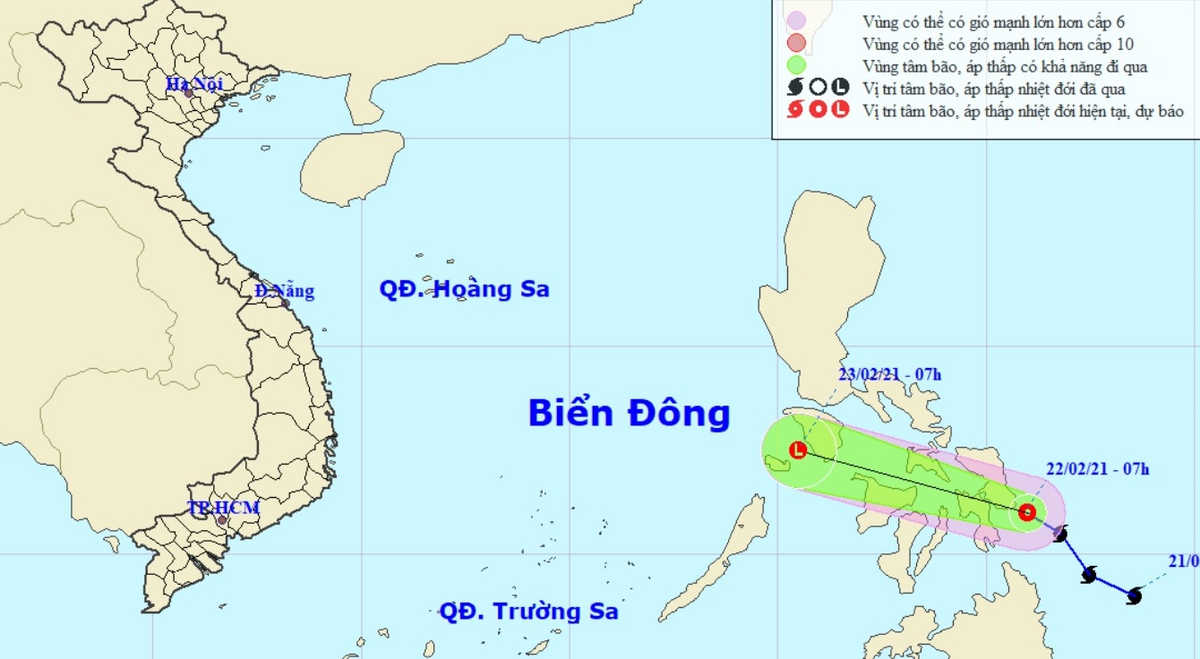 Đến 7h ngày 23/2, vị trí trung tâm vùng áp thấp ở khoảng 12,5 độ Vĩ Bắc; 120,5 độ Kinh Đông, trên khu vực miền Trung Philippines. Sức gió mạnh nhất ở trung tâm vùng áp thấp giảm xuống dưới cấp 6 (dưới 40km/giờ).