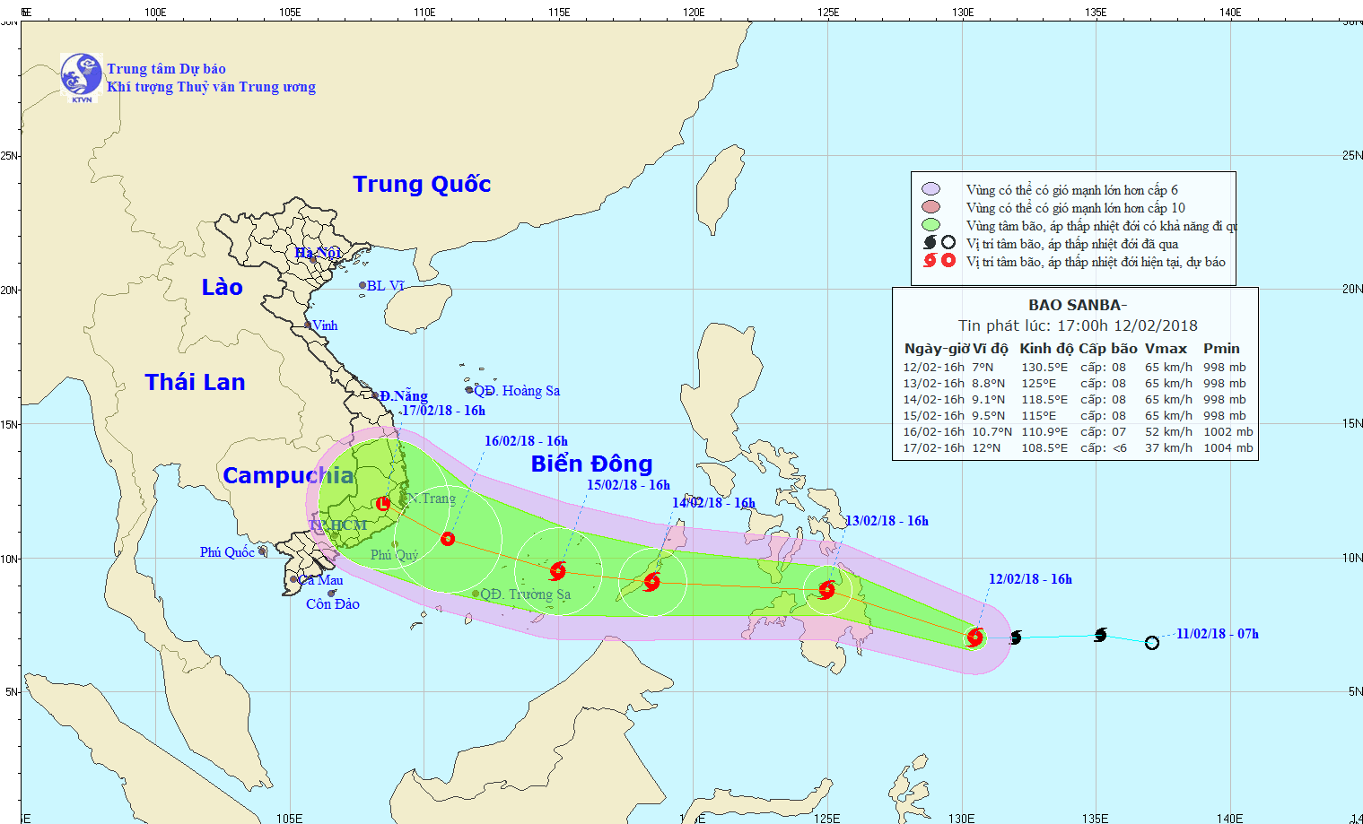 Hồi 16h ngày 12/2, vị trí tâm bão Sanba ở vào khoảng 7,0 độ Vĩ Bắc; 130,5 độ Kinh Đông, cách bờ biển miền Nam Philippines khoảng 470km về phía Đông.