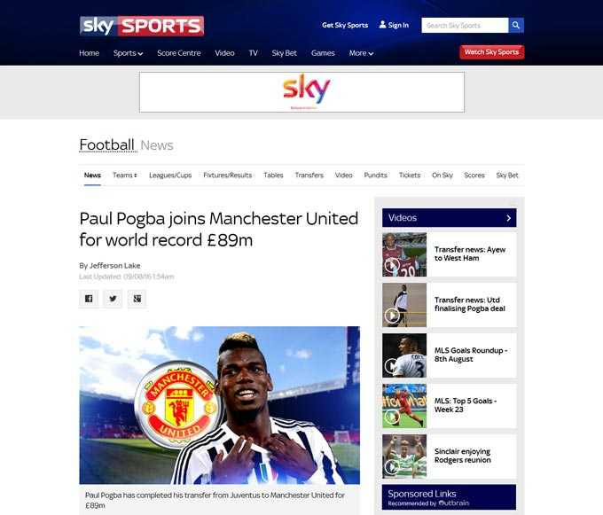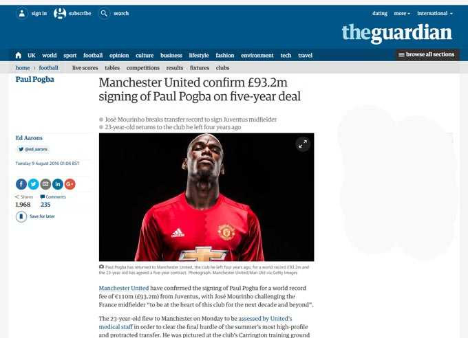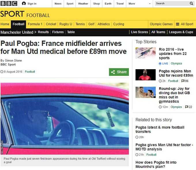 BBC: Pogba đầu quân cho Manchester United với mức giá 89 triệu bảng, tương đương 105 triệu euro, chưa kể phụ phí. Đây là lần đầu tiên sau 20 năm, kể từ vụ chuyển nhượng Alan Shearer từ Blackburn Rovers đến Newcastle với giá 15 triệu bảng, một đội bóng Anh mới lại xô đổ kỷ lục chuyển nhượng.