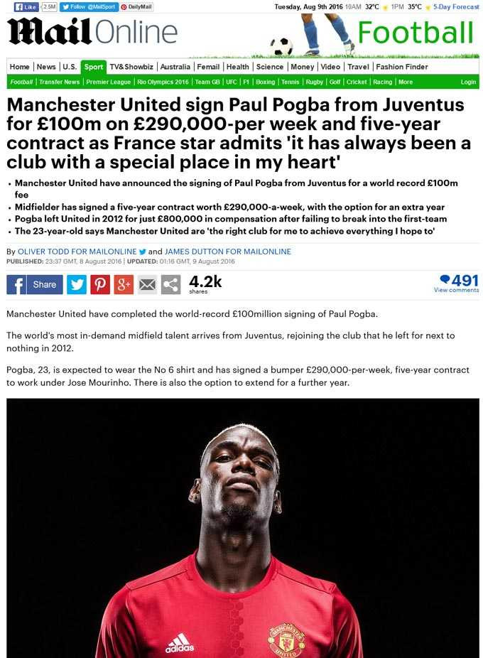 Daily Mail: Khác với BBC, Daily Mail đưa tin Pogba gia nhập M.U với giá 100 triệu bảng, ký hợp đồng 5 năm kèm điều khoản gia hạn 1 năm, hưởng lương 290.000 bảng/tuần và khoác áo số 6.