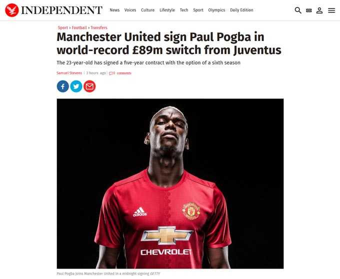 Independent: Pogba rời M.U cách đây 4 năm với một khoản phí thanh toán đào tạo trẻ không đáng kể để đến Juventus. Tại đây, Pogba trưởng thành nhanh chóng và giành được 4 chức vô địch Serie A, 2 chức vô địch Coppa Italia. Màn trình diễn ấy thuyết phục Mourinho đưa Pogba trở lại Old Trafford với mức phí chuyển nhượng kỷ lục 89 triệu bảng.