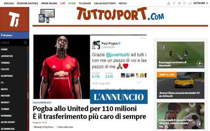 La Gazzetta delo Sport: Tờ nhật báo thể thao hàng đầu Italia đưa tin Juventus sẽ nhận được tối đa 110 triệu euro (105 triệu euro định phí, 5 triệu euro biến phí) từ việc bán Pogba cho Manchester United.