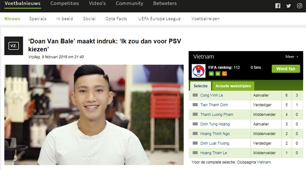 Ngay trong phần tiêu đề bài viết, Voetbalzone đã gọi Đoàn Văn Hậu là "Đoan Van Bale" cùng một ý kiến giới thiệu Đoàn Văn Hậu tới CLB danh tiếng của Hà Lan là PSV.