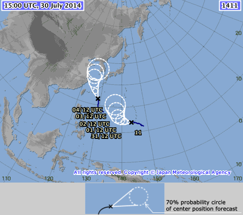 | Sơ đồ dự báo hướng di chuyển của bão Hạ Long và áp thấp nhiệt đới trong 5 ngày từ 31/7 đến 4/8. Vị trí số 11 là bão Hạ Long, phía trên là áp thấp nhiệt đới - Nguồn: Cơ quan khí tượng Nhật Bản |