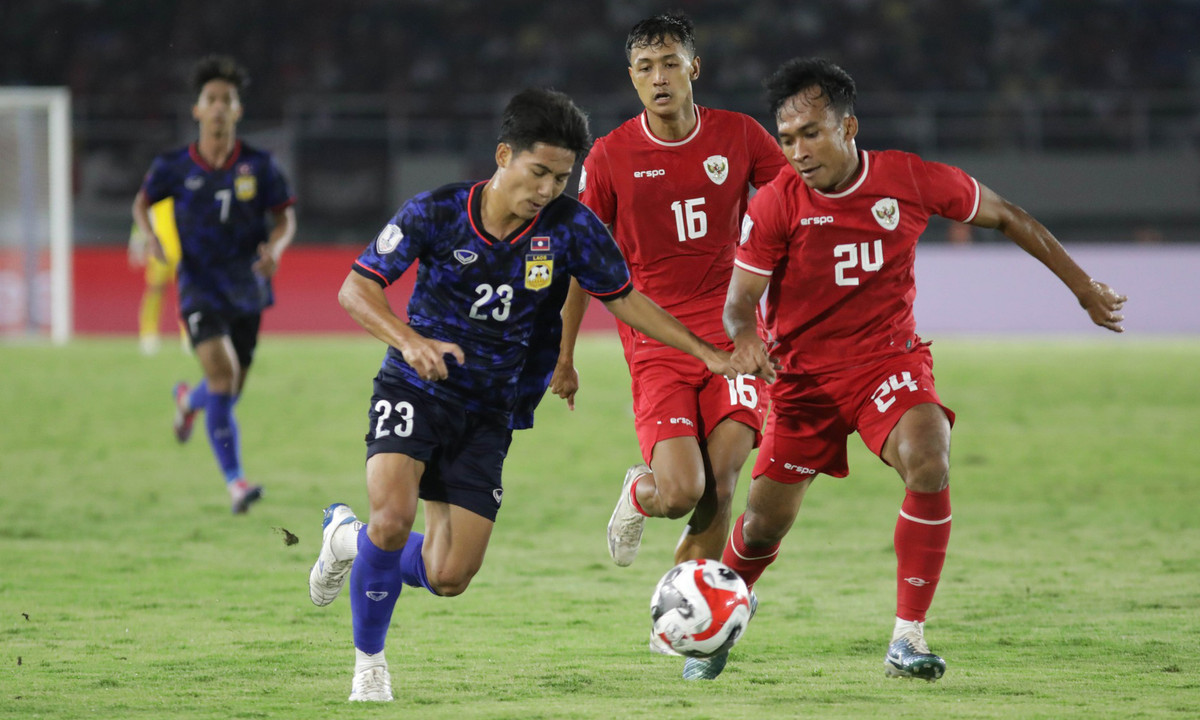 Đội tuyển Indonesia (áo đỏ) thủng lưới 3 lần trước Lào ngay trên sân nhà.