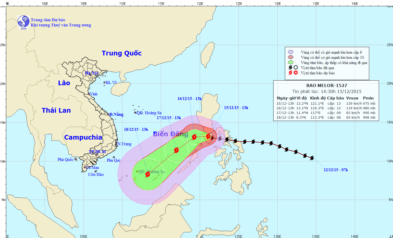 Hồi 14h ngày 15/12, vị trí tâm bão Melor ở vào khoảng 13,2 độ Vĩ Bắc; 121,1 độ Kinh Đông, trên khu vực miền Trung Philippin.