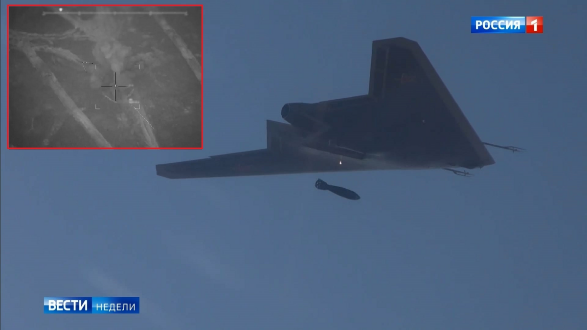 S-70 Okhotnik trong đợt thử nghiệm ném bom gần đây. (Ảnh: Russia 1)