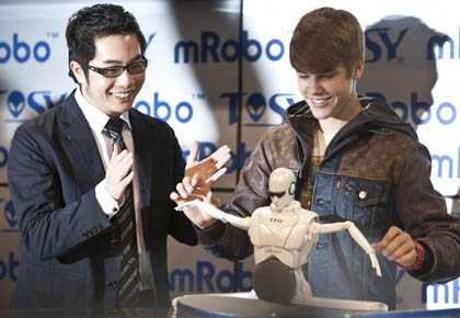 | Justin Bieber giới thiệu robot mRobo bên cạnh ông Hồ Vĩnh Hoàng - Giám đốc Tosy - ảnh: Dalje |