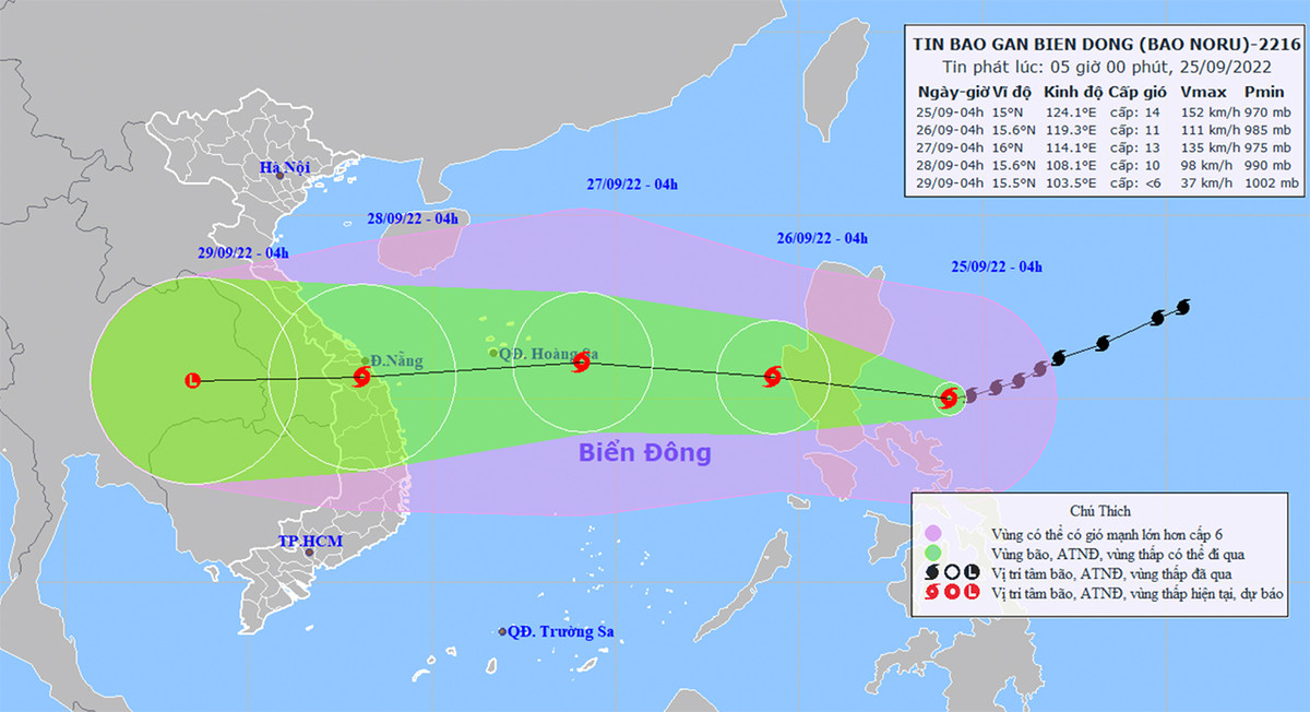 Theo Trung tâm Dự báo KTTV quốc gia, lúc 4h ngày 25/9, vị trí tâm bão Noru cách đảo Luzon (Philippines) khoảng 300km về phía Đông. Sức gió mạnh nhất vùng gần tâm bão mạnh cấp 14 (150-166km/giờ), giật cấp 17.