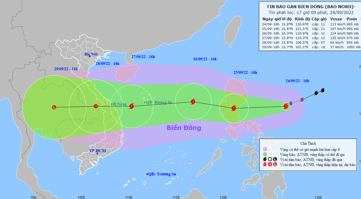 Dự báo đường đi của bão Noru cập nhật đến 17h ngày 24/9. (Ảnh: Trung tâm Dự báo KTTV Quốc gia)