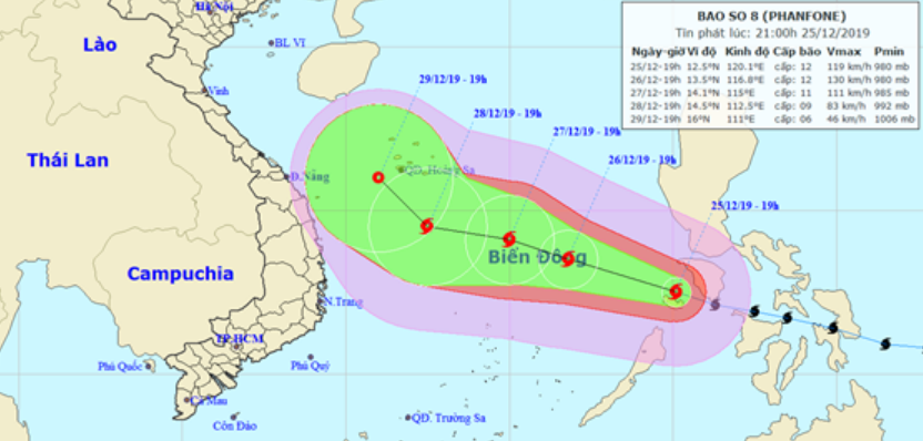 Theo Trung tâm Dự báo Khí tượng Thủy văn Quốc gia, hồi 20h ngày 25/12, bão số 8 cách đảo Song Tử Tây khoảng 620km về phía Đông Đông Bắc. Sức gió mạnh nhất vùng gần tâm bão mạnh cấp 12 (115-135km/giờ), giật cấp 14.