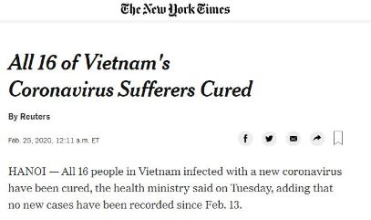 Reuters hôm 25/2 dẫn tin từ Bộ Y tế Việt Nam cho biết tất cả 16 người ở Việt Nam bị nhiễm corona virus mới đã được chữa khỏi. Nhiều báo quốc tế khác như New York Times, Bangkok Post, Japan Today,... dẫn lại thông tin này.