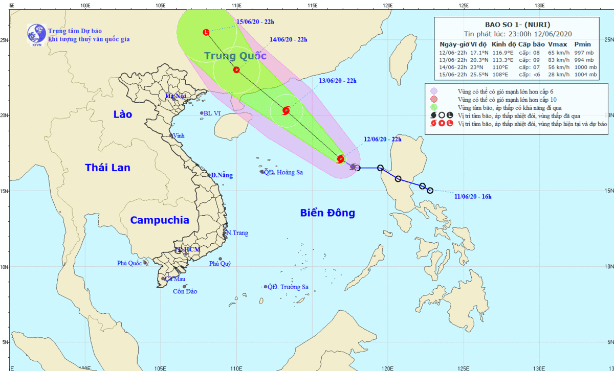 Đến 22h ngày 13/6, vị trí tâm bão ở khoảng 20,3 độ Vĩ Bắc; 113,3 độ Kinh Đông, cách quần đảo Hoàng Sa khoảng 320km về phía Bắc Đông Bắc. Sức gió mạnh nhất vùng gần tâm bão mạnh cấp 9 (75-90km/giờ), giật cấp 12.
