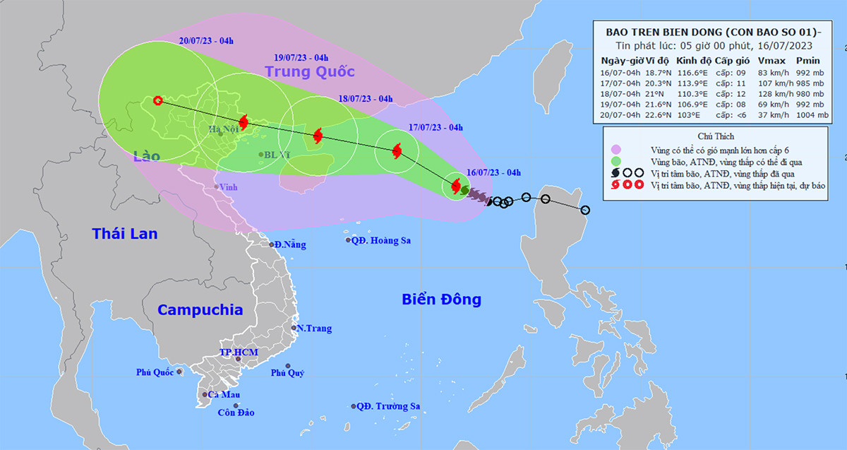 Đến 4h ngày 17/7, bão số 1 trên vùng biển phía Bắc khu vực Bắc Biển Đông, cách bán đảo Lôi Châu (Trung Quốc) khoảng 380km về phía Đông Đông Nam, di chuyển theo hướng Tây Bắc, mỗi giờ đi được 10-15 km, sức gió mạnh nhất vùng gần tâm bão cấp 10-11, giật cấp 14, bão có khả năng mạnh thêm.