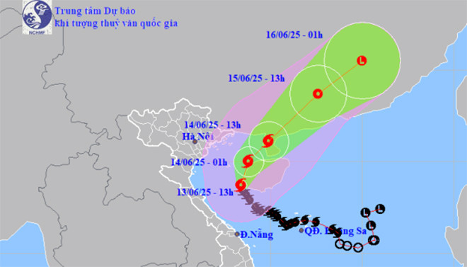 Lúc 13h ngày 13/6, tâm bão số 1 trên vùng biển phía Đông khu vực vịnh Bắc Bộ, cách đảo Bạch Long Vĩ khoảng 235km về phía Nam Đông Nam. Sức gió mạnh nhất vùng gần tâm bão mạnh cấp 11 (103-117km/h), giật cấp 14. Bão di chuyển theo hướng Bắc với tốc độ 10-15km/h.