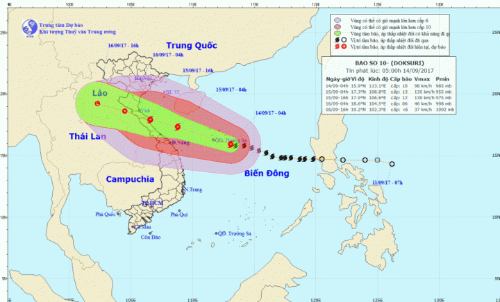 Thông tin mới nhất về cơn bão số 10, hồi 10h ngày 14/9, vị trí tâm bão ở vào khoảng 16,3 độ Vĩ Bắc; 111,8 độ Kinh Đông, ngay trên vùng biển quần đảo Hoàng Sa, cách bờ biển các tỉnh từ Hà Tĩnh đến Quảng Bình khoảng 600km về phía Đông Đông Nam. Sức gió mạnh nhất ở vùng gần tâm bão mạnh cấp 11 (100 đến 115 km/giờ), giật cấp 14.