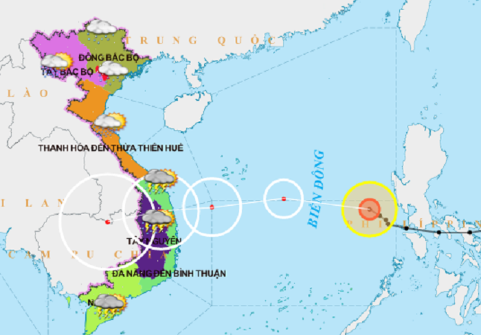 Vùng nguy hiểm do bão trên Biển Đông trong 24h tới (gió mạnh từ cấp 6 trở lên, giật từ cấp 8 trở lên): từ vĩ tuyến 13,0 đến 17,0 độ Vĩ Bắc; từ kinh tuyến 111,5 đến 120,0 độ Kinh Đông.