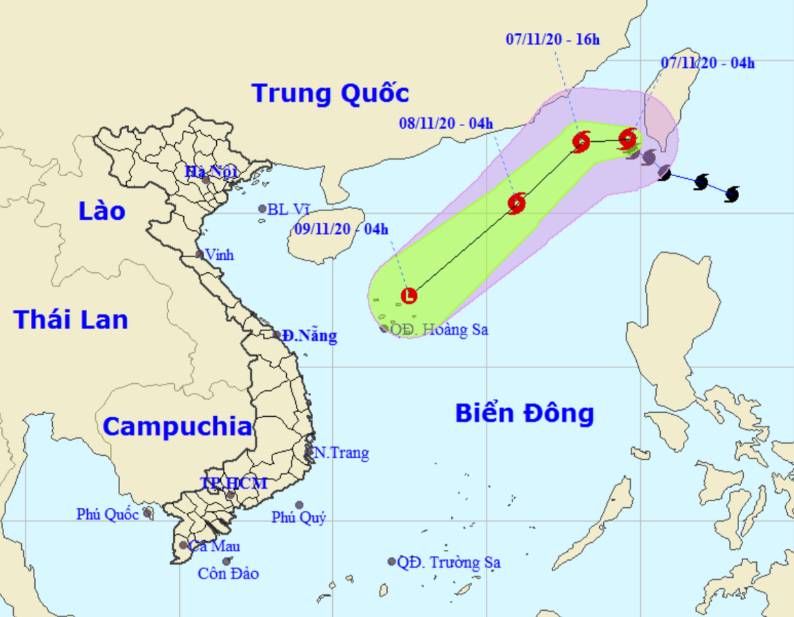 Dự báo trong 12 giờ tới, bão di chuyển theo hướng Tây, mỗi giờ đi được khoảng 10km. Đến 16h ngày 7/11, tâm bão ở cách đảo Đài Loan khoảng 220km về phía Tây Tây Nam. Sức gió mạnh nhất vùng gần tâm bão mạnh cấp 8-9 (60-90km/giờ), giật trên cấp 11.