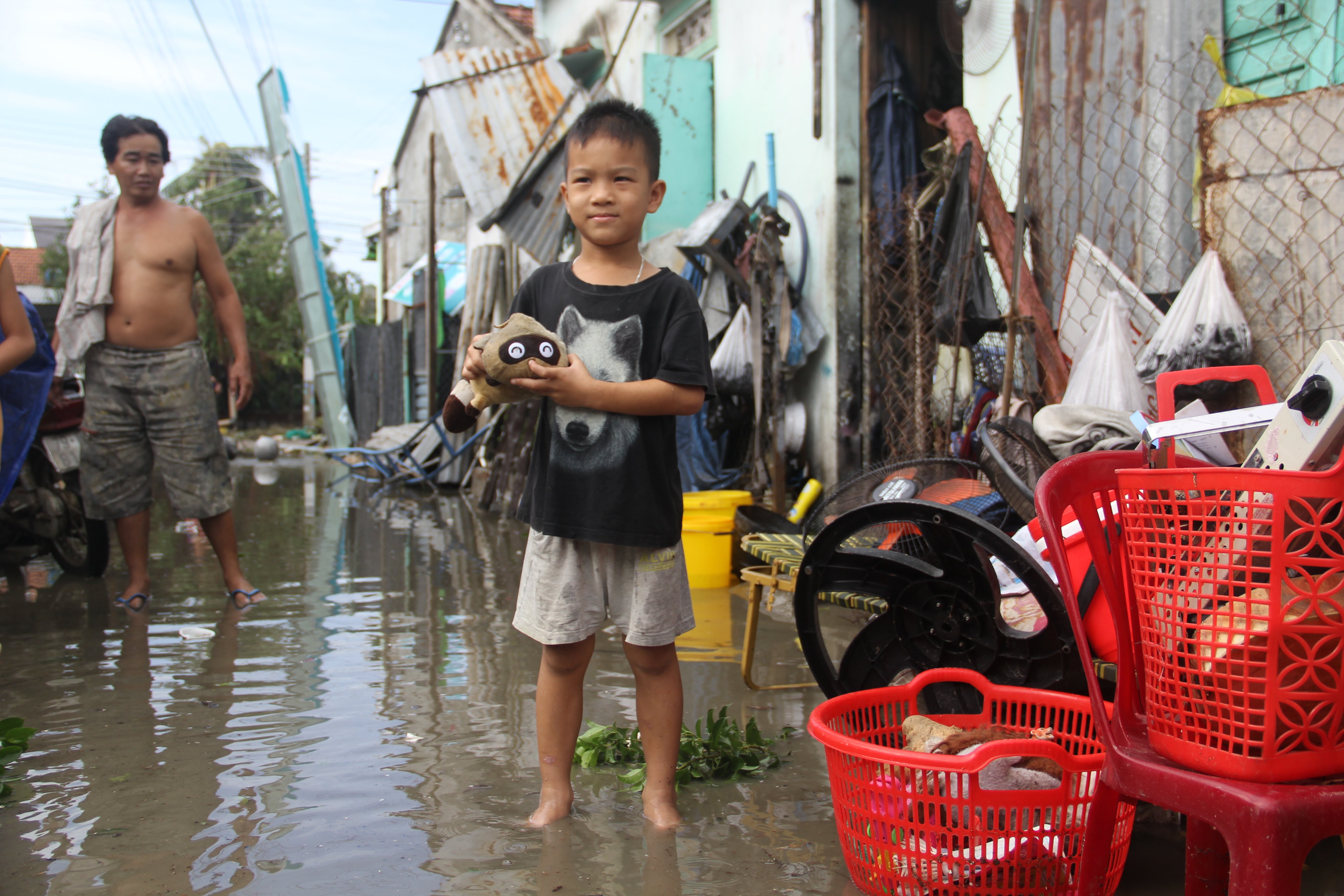 Khuôn mặt buồn bã của đứa trẻ vùng biển sau khi cơn bão đi qua.