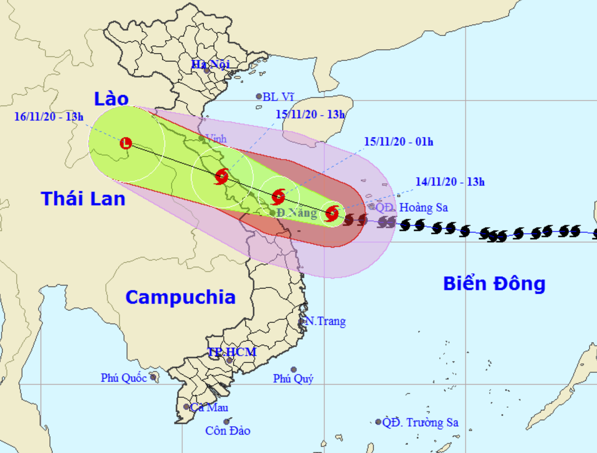 Theo Trung tâm Dự báo KTTV quốc gia, lúc 15h ngày 14/11, tâm bão số 13 (Vamco) cách Đà Nẵng khoảng 187km, Thừa Thiên Huế khoảng 280km, Quảng Trị khoảng 330km. Sức gió mạnh nhất vùng gần tâm bão mạnh cấp 12-13 (115-150km/giờ), giật cấp 16.